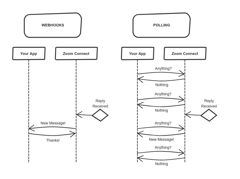 Zoom Connect provides two possible methods for receiving replies by API, either by Webhooks or by Polling. Using Webhooks is the preferred method as it allows messages to be received efficiently and in real-time.